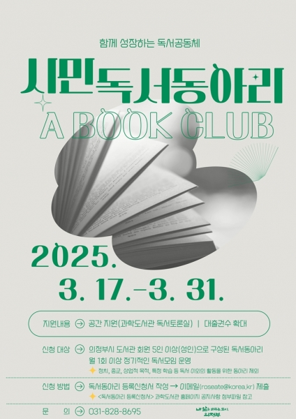 독서동아리 등록을 원하는 시민은 3월 17일부터 31일까지 신청서를 작성해 담당자 전자우편으로 제출하면 된다.