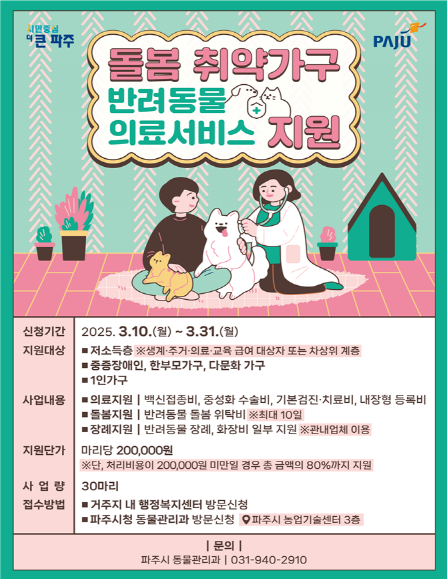[금요저널] 파주시는 반려동물을 양육하는 사회경제적 취약가구를 대상으로 ‘돌봄 취약가구 반려동물 의료서비스 등 지원사업’을 실시한다.