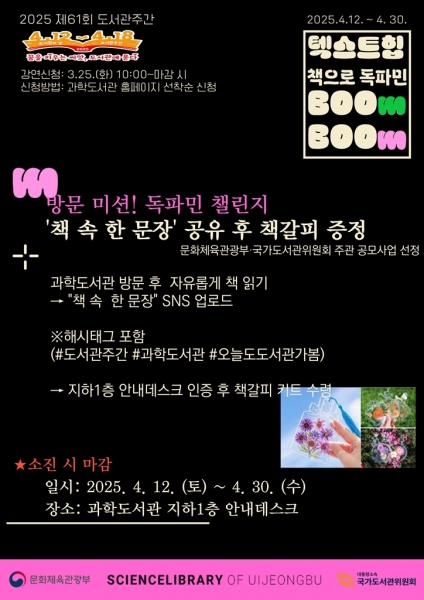 [금요저널] 의정부과학도서관은 ‘제61회 도서관주간’과 ‘제3회 도서관’의 날을 맞아 4월 12일부터 30일까지 다채로운 강연과 독서 챌린지를 운영한다.