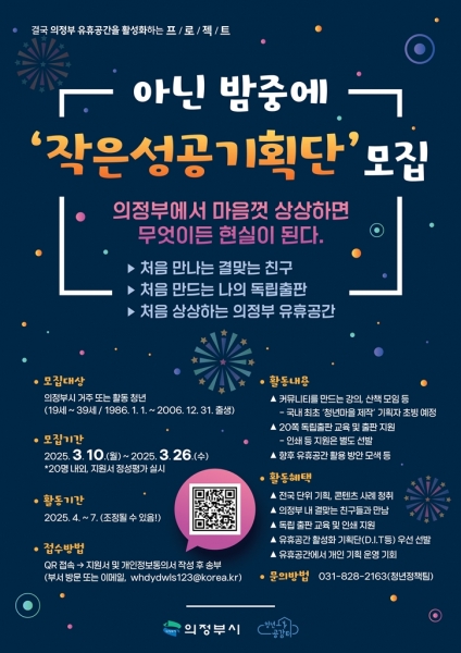 작은성공기획단 모집 및 활동에 대한 자세한 내용은 의정부시 공고를 확인하거나 청년정책과로 문의하면 확인할 수 있다.