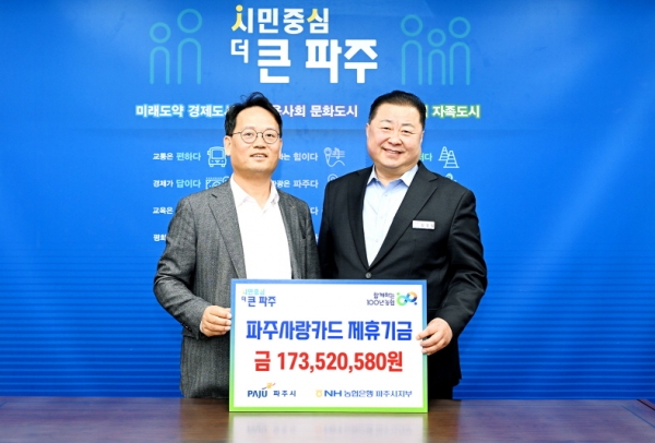 이학필 엔에이치농협은행 파주시지부장은 “제휴카드 적립기금이 지역발전에 보탬이 되길 바란다”며 “앞으로도 농협은행은 다양한 협력을 통해 지역사회에 봉사하는 금융기관이 되겠다”고 말했다.