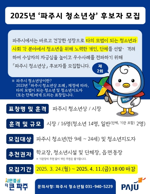 자세한 사항은 표창 추천기관 또는 파주시 청소년상 담당자에게 문의하면 된다.