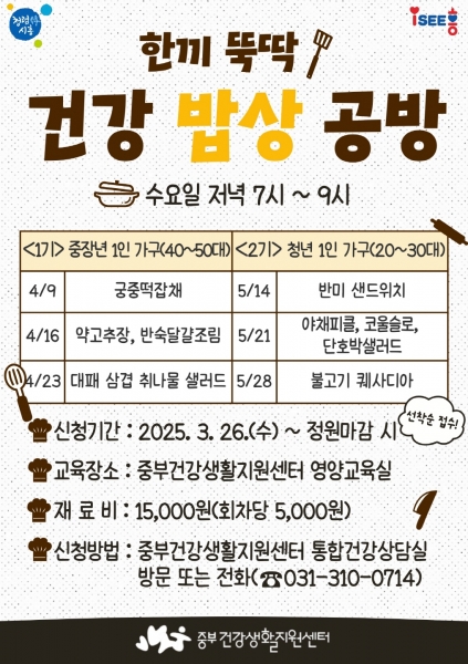 ‘한 끼 뚝딱, 건강 밥상 공방’은 4월부터 7월까지 매주 수요일 저녁 7시부터 2시간 동안 중부건강생활지원센터 3층 영양교육실에서 진행되며 기수별로 3회씩 총 5개 기수가 운영된다.