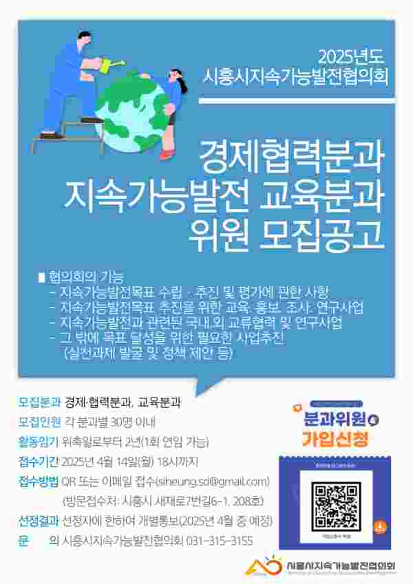 [금요저널] 시흥시지속가능발전협의회는 2025년 경제·협력분과 및 지속가능발전 교육분과 위원을 공개 모집한다.