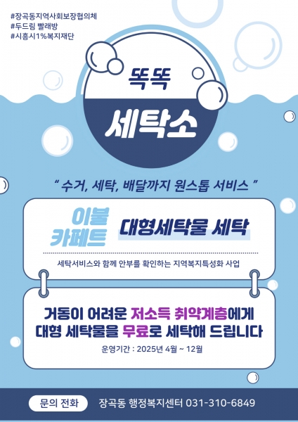 ‘똑똑 세탁소’는 혼자 사는 어르신, 장애인, 질병 등으로 대형 이불 세탁이 어려운 주민을 위한 장곡형 복지특화사업의 일환이자, 시흥시1%복지재단 지역복지특성화사업으로 고독사 예방을 위해 추진된다.