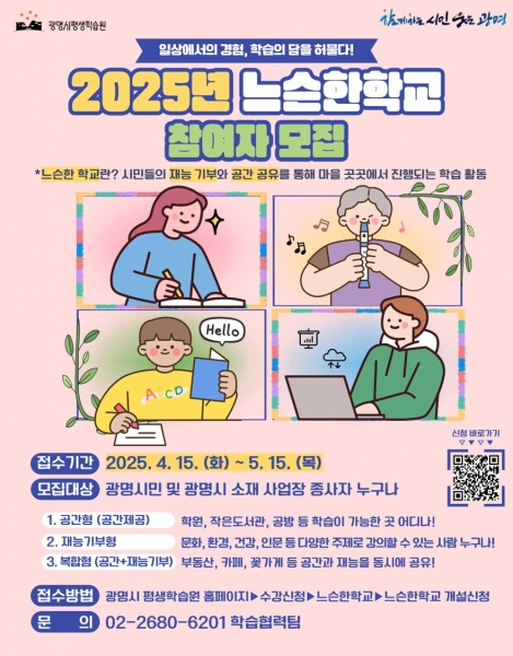 정찬수 평생학습원장은 “시민이 스스로 가르치고 배우며 일상에서 학습의 기회를 만들어가는 것이 진정한 평생학습도시의 모습”이라며 “느슨한학교 운영으로 광명시 곳곳이 배움과 나눔의 공간으로 거듭나길 바란다”고 밝혔다.