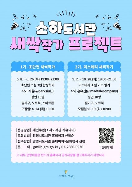 한편 광명시 소하도서관은 2023년 시민 창작공간 ‘생각쓰기 방’을 조성한 이후 꾸준히 시민 창작활동을 지원하고 있으며 시·에세이·블로그 등 다양한 글쓰기를 주제로 한 ‘소하사계’ 글쓰기 프로그램도 운영 중이다.