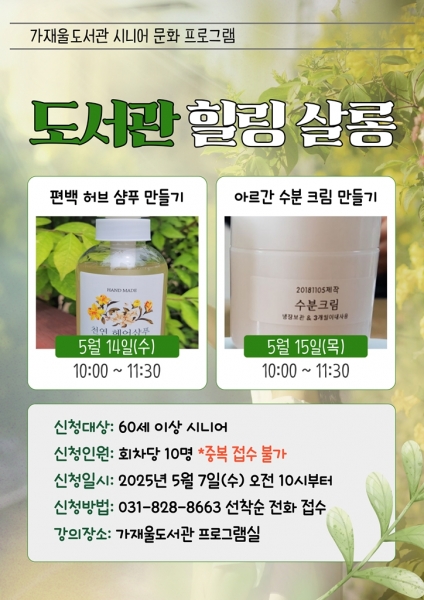 총 2개 강좌를 운영할 예정으로 첫째 날인 5월 14일 오전 10시부터 11시 30분까지는 ‘편백 허브 샴푸 만들기’ 강좌를 진행한다.