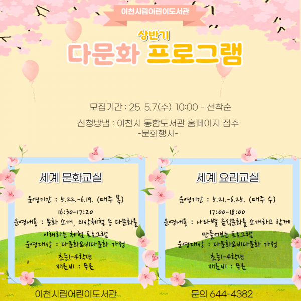 수강생 모집은 2025년 5월 7일부터 도서관 누리집을 통해 선착순으로 하며 자세한 문의는 이천시립어린이도서관으로 하면 된다.