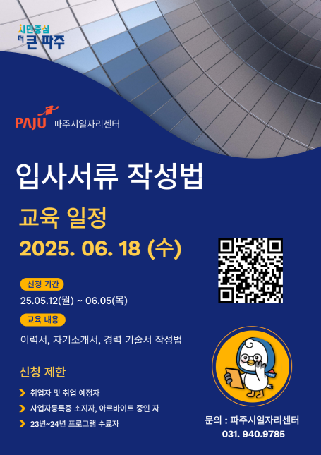 교육은 하루 동안 파주시 일자리센터에서 진행되며 참가비는 없다.