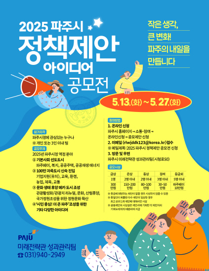 [금요저널] 파주시가 ‘2025년 파주시 정책 제안 아이디어 공모전’을 5월 13일부터 27일까지 개최한다.