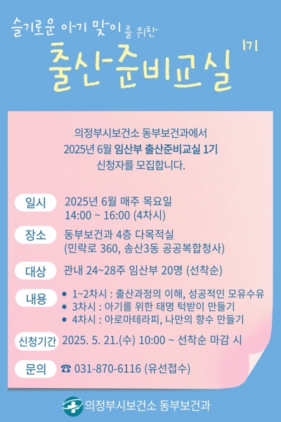 [금요저널] 의정부시 보건소는 관내 24~28주 임산부를 대상으로 ‘임산부 출산준비교실’ 프로그램 1기 대상자 20명을 5월 21일부터 선착순 모집한다.