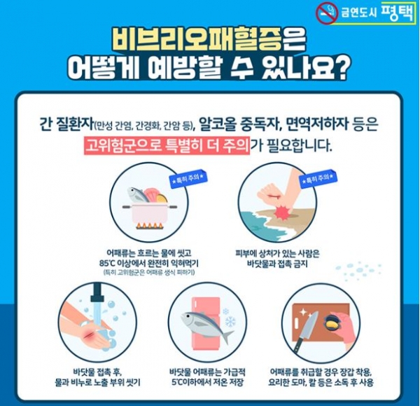 송탄보건소 관계자는 “따뜻해진 날씨로 인해 비브리오패혈증 환자 발생이 우려된다 익히지 않은 어패류 섭취를 삼가고 조리 기구를 철저히 소독하는 등 예방수칙을 준수해 나와 우리 가족, 지역사회의 건강을 지켜주시길 바란다”고 강조했다.