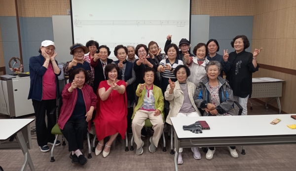 이번 봄 특강은 지난 3월 17일부터 5월 26일까지 매주 월요일 오전 10시부터 11시까지 진행됐으며 전문 노래교실 강사의 지도로 참가 어르신들은 즐겁게 노래를 배우며 인지기능 향상과 스트레스 해소의 시간을 가졌다.