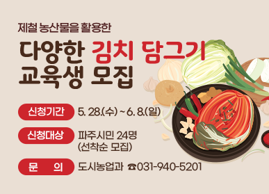 [금요저널] 파주시는 5월 28일부터 제철 농산물을 활용한 ‘다양한 김치 담그기’에 참여할 교육생 24명을 선착순으로 모집한다.