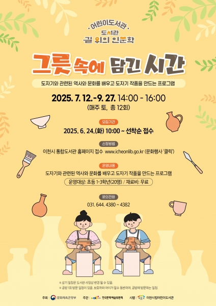 [금요저널] 이천시 어린이도서관은 문화체육관광부가 주최하고 한국문화예술위원회가 주관하는 2025년 길 위의 인문학 사업에 선정돼 ‘그릇 속에 담긴 시간’ 이란 주제로 어린이 인문학강연과 탐방을 연계한 프로그램을 운영한다.