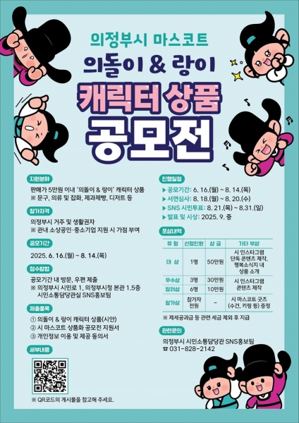 김동근 시장은 “의돌이와 랑이는 단순한 캐릭터가 아니라 의정부시를 대표하는 마스코트로서 큰 의미를 가진다”며 “이번 공모전이 지역경제에 온기를 더하고 마스코트 사용을 활성화하는 계기가 되길 바란다”고 말했다.