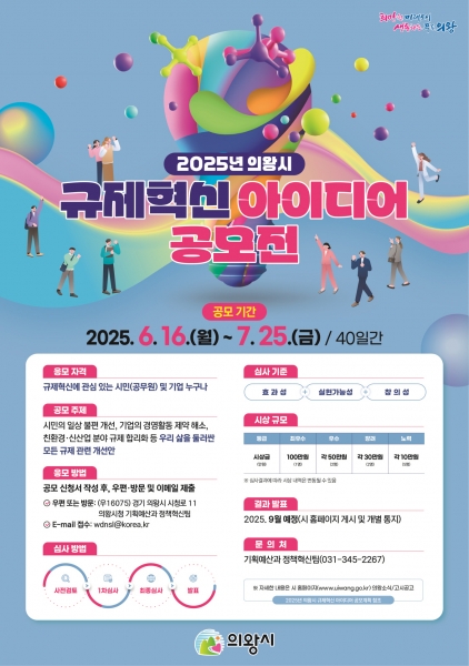 [금요저널] 의왕시는 시민의 일상생활과 기업의 경제활동에서 겪는 불합리한 규제를 발굴해 개선하기 위해 ‘2025년 의왕시 규제혁신 아이디어 공모전’을 개최한다.
