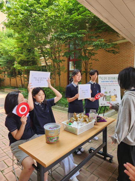 학생자치회 및 환경동아리에서는 자원순환에 대한 책임감 함양을 위해 ‘분리배출퀴즈 부스’를 운영했고 ‘텀블러사용 이벤트’, ‘잔반 남기지않기 캠페인’을 진행하고 있다.