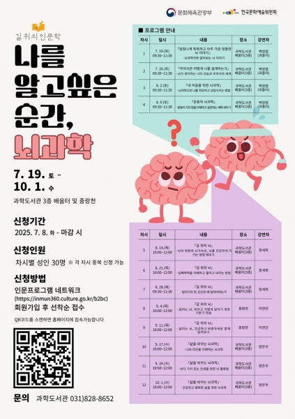[금요저널] 의정부과학도서관은 7월 19일부터 10월 1일까지 2025년 ‘길 위의 인문학’ 선정 프로그램 ‘나를 알고 싶은 순간, 뇌과학’을 운영한다.