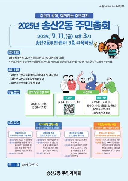 [금요저널] 의정부시 송산2동주민센터는 송산2동 주민자치회가 ‘2025년 송산2동 주민총회’를 앞두고 2026년 자치계획 사업에 대한 주민의 의견을 듣고자 온라인·오프라인 사전투표를 실시한다고 23일 밝혔다.