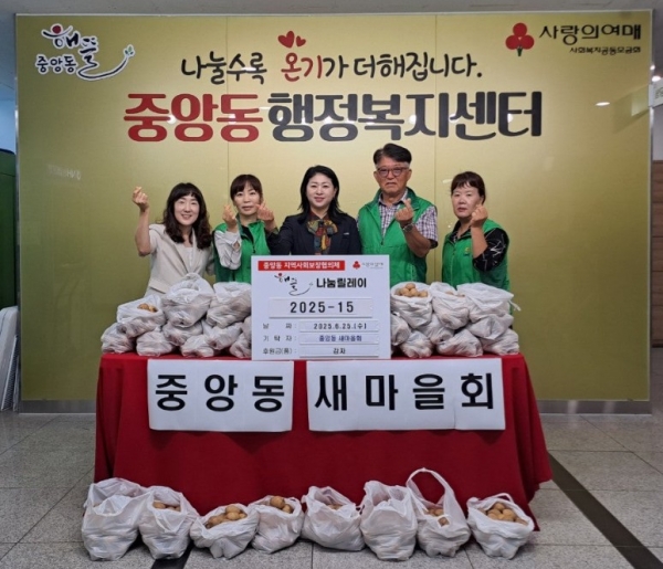 기탁된 감자는 중앙동 새마을회 회원들이 정성껏 손수 심고 수확한 것으로 관내 저소득 가구, 한부모 가구, 독거노인 가구 등 경제적 어려움을 겪는 이웃에게 전달되어 따뜻한 마음을 함께 나누는 뜻깊은 나눔 활동으로 이어졌다.