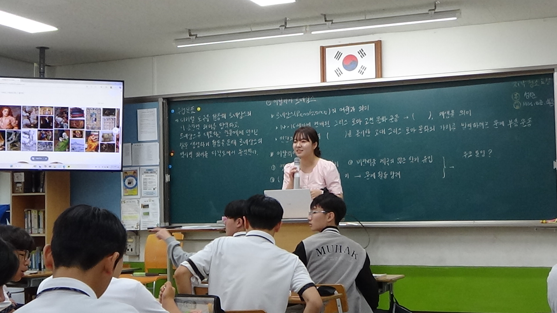 특히 대외 공개로 진행된 2학년 역사(손채아 교사) 수업이 많은 관심을 받았다. ‘르네상스는 왜 이탈리아에서 시작되었으며, 르네상스를 대표하는 인물들은 어떠한 생각을 갖고 삶을 살아갔을까?’라는 핵심 질문을 바탕으로 학생의 사고를 확장했다.