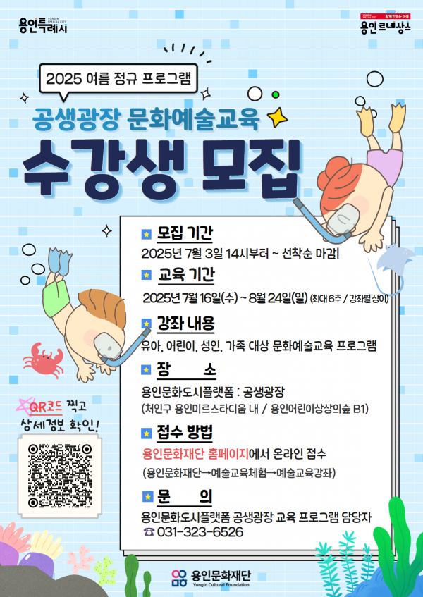 [금요저널] 용인문화재단은 7월 3일부터 ‘2025년 용인문화도시플랫폼 공생광장 문화예술교육 프로그램’의 여름 정규 강좌 수강생을 모집한다.
