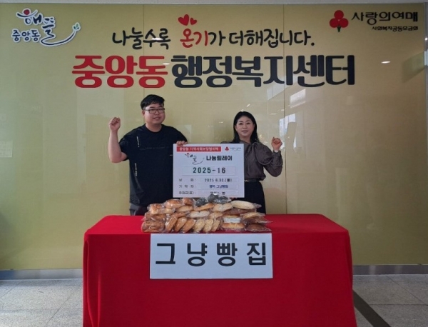 백경희 중앙동장은 “지역 내 어려운 이웃을 위해 기꺼이 빵을 후원해주신 ‘그냥, 빵집’에 진심으로 감사드린다”며 “후원받은 빵은 이웃들에게 정성과 함께 소중히 전달하겠으며 앞으로도 지속적인 나눔 활동을 통해 지역사회의 온정을 확산해 나가겠다”고 밝혔다.