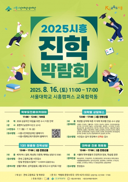 [금요저널] 시흥시는 시흥시인재양성재단이 시 교육자치과, 시흥진로체험지원센터, 시흥교육지원청과 공동 주관으로 오는 8월 16일 오전 11시부터 오후 5시까지 서울대학교 시흥캠퍼스 교육협력동에서 ‘2025년 시흥 진학 박람회’를 개최한다고 9일 밝혔다.