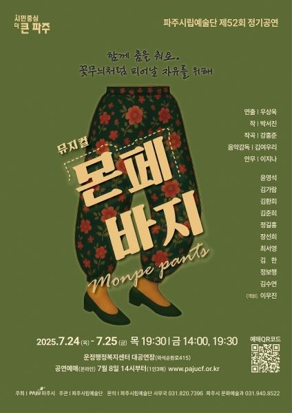 [금요저널] 파주시는 시립예술단 제52회 정기공연으로 광복 80주년을 맞아, 일제강점기를 살아간 소시민들의 저항과 일상을 조명하는 창작 뮤지컬 ‘몬페 바지’를 오는 7월 24일과 25일 총 3회에 걸쳐 운정행복센터 대공연장에서 선보인다.