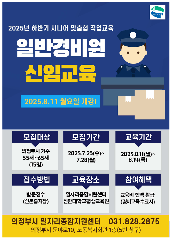 [금요저널] 의정부시는 관내 시니어 세대의 재취업을 지원하고 안정적인 일자리를 연계하기 위해 ‘일반경비원 신임교육’ 참여자를 모집한다.