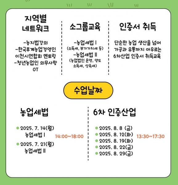 한편 이천시농업기술센터서는 청년 후계농을 위해 7월 31일까지 △지역별 네트워크 교육을 진행 중이며 농업의 고부가가치화를 실현하고자 △6차 산업인증 취득 관련 교육을 운영할 예정이다.
