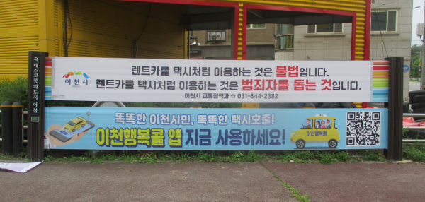 이천시는 2024년 접수된 불법 유상운송 신고에 대해 수사 의뢰를 모두 마치고 시민의 안전한 교통 이용을 유도하고 불법 유상운송 근절에 대한 인식을 높이기 위해 시내 주요 도로와 교통시설 주변 20개소에 ‘불법렌터카 이용금지’를 안내하는 홍보 현수막을 설치했다.