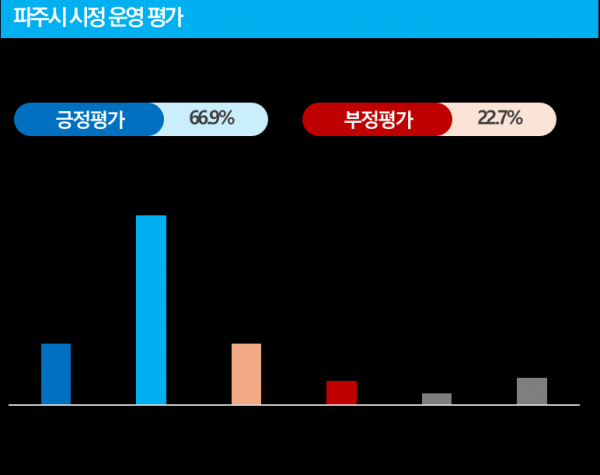 파주시가 의뢰하고 여론조사기관 ㈜글로벌리서치에서 수행한 조사 결과에 따르면 파주시정에 대한 긍정 평가가 66.9%로 부정 평가 22.7%보다 월등히 높은 것으로 나타났다.