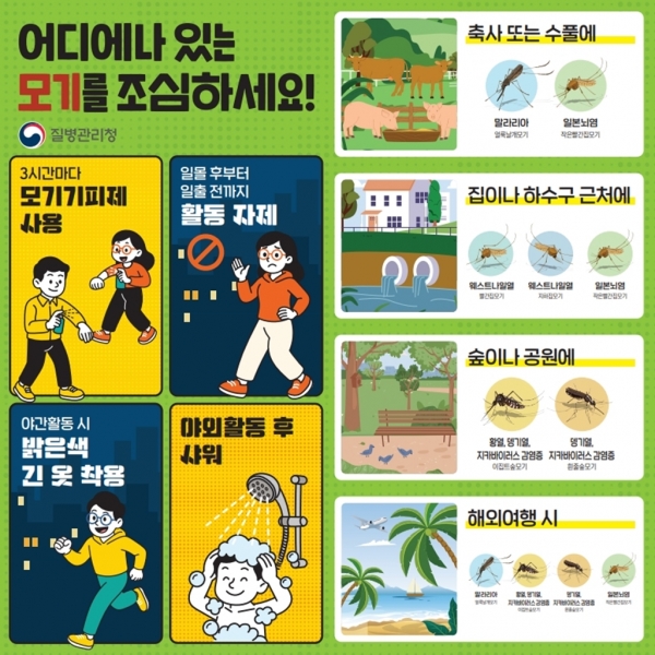 모기매개감염병은 고인 물 제거, 야간 외출 자제, 방충망 점검, 기피제 사용 등을 통해 예방할 수 있다.