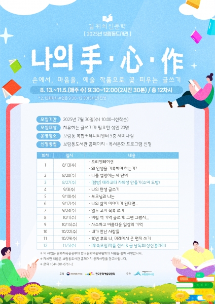 보람동도서관은 오는 8월 13일부터 11월 5일까지 12회에 걸쳐 ‘나의 수·심·작 손에서 마음을, 예술 작품으로 꽃 피우는 글쓰기’ 강좌를 운영한다.