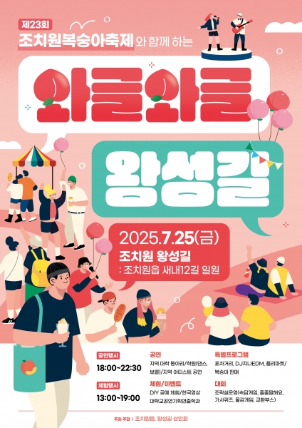 [금요저널] 세종시 조치원읍이 오는 25일 오후 1시부터 조치원 왕성길 일원에서 세종 조치원복숭아 축제의 시작을 알리는 ‘2025 와글와글 왕성길 축제’를 개최한다.