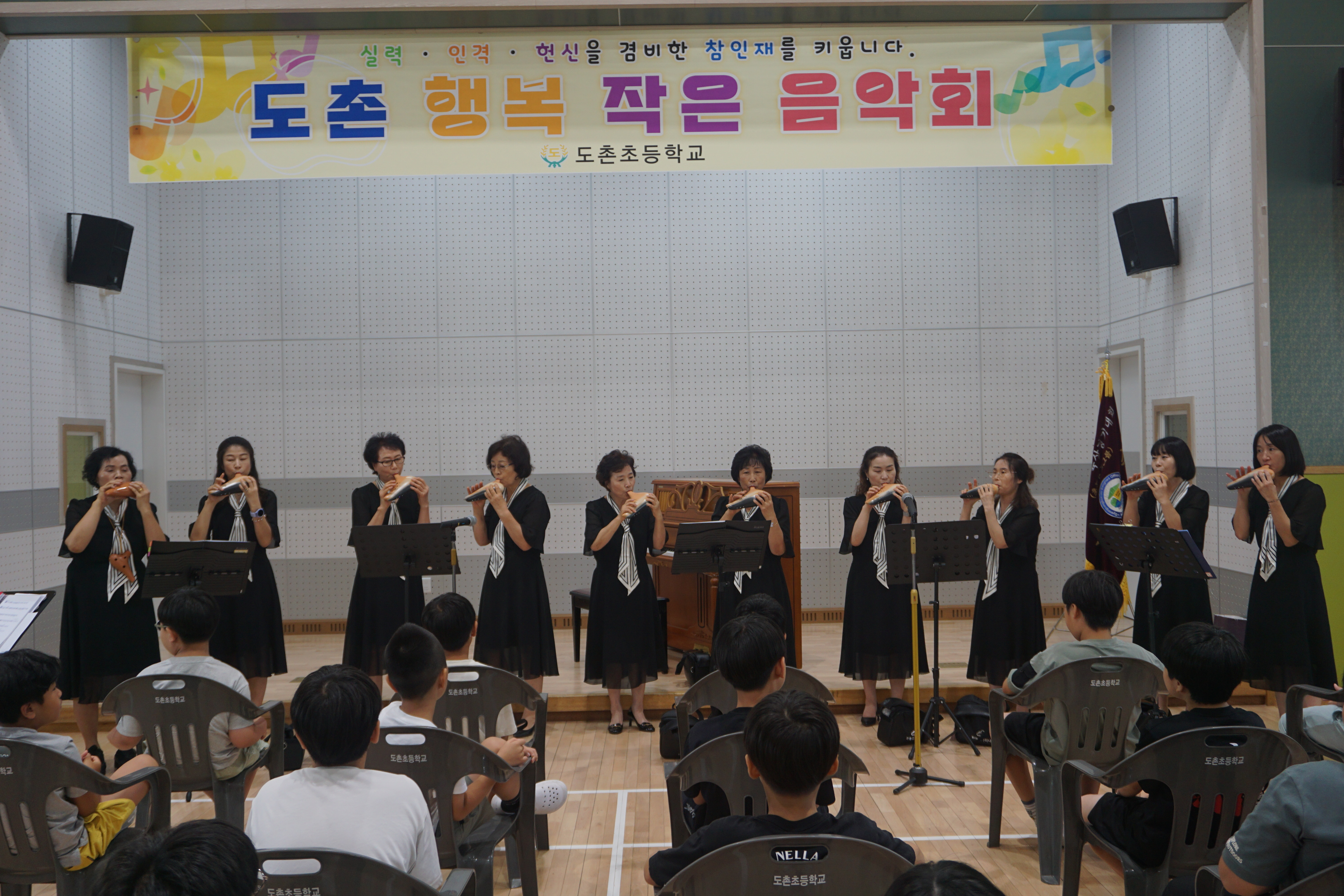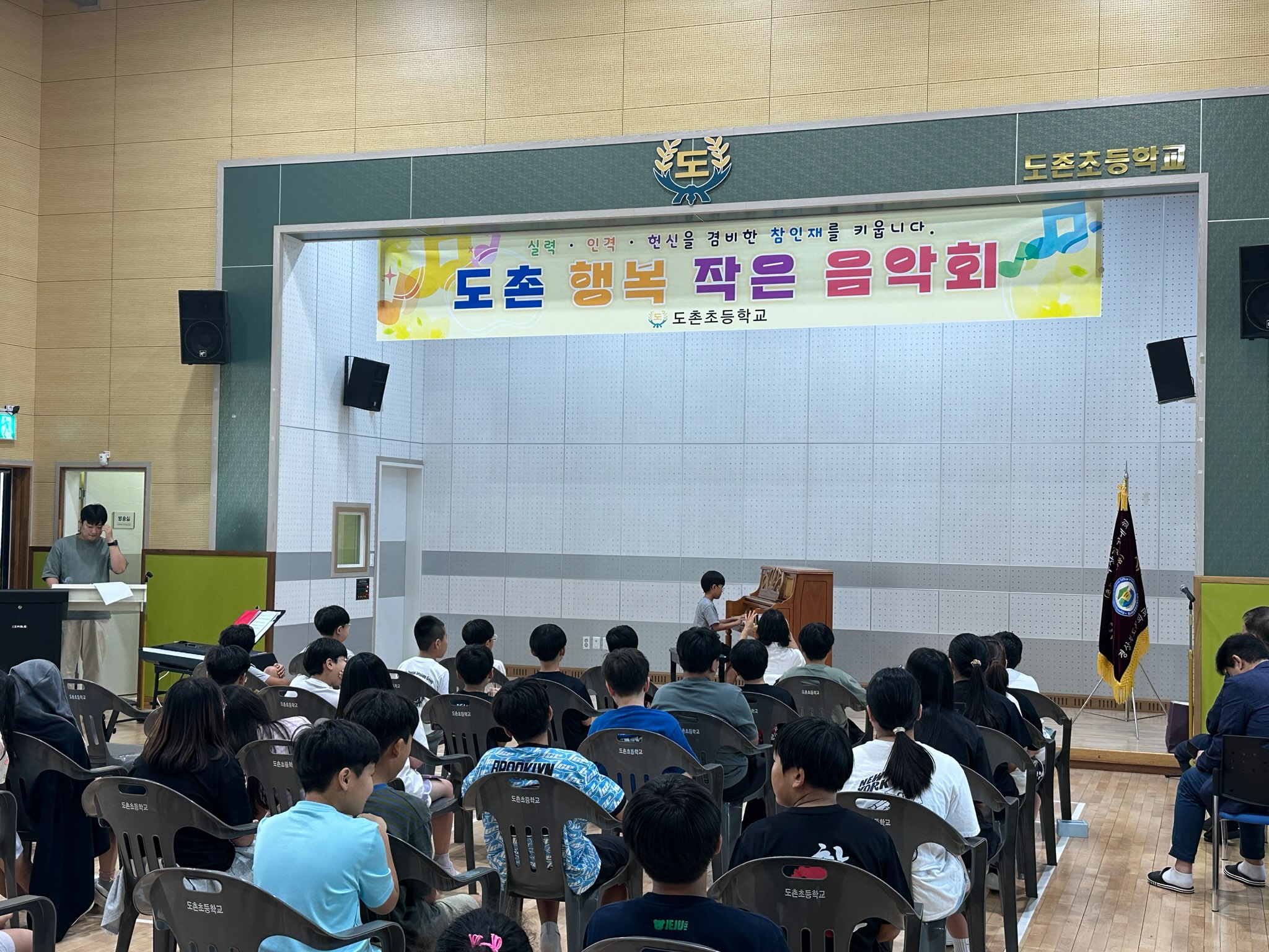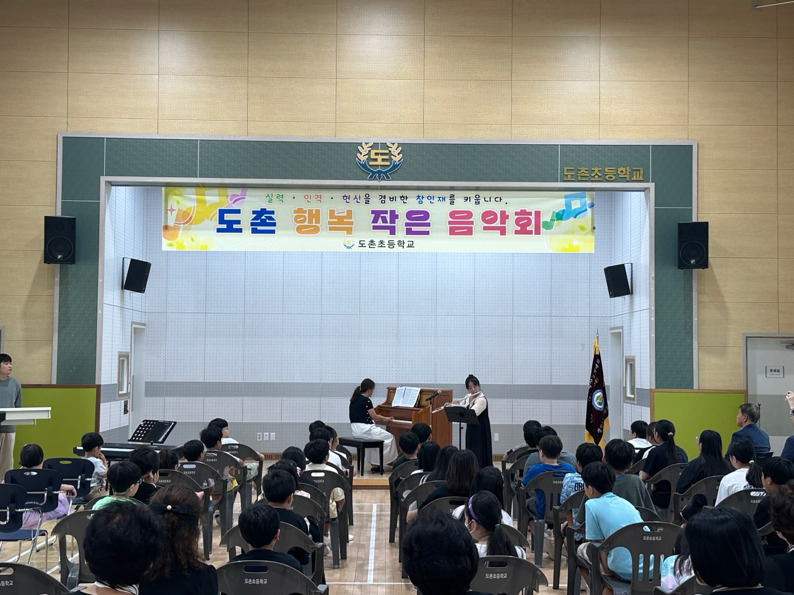 □도촌초등학교(교장 윤석근)는 7월 18일(금)에 도솔관에서 여름방학을 맞아 행복 작은 음악회를 개최하였다. 늘봄학교 맞춤형 및 선택형 프로그램으로 배우고 있는 피아노에 대한 관심을 높이고 1학기 동안 학교생활을 열심히 한 학생들과 교직원에게 선물을 주기 위해 피아노, 오카리나, 플롯, 노래를 감상할 수 있는 기회를 제공하였다.