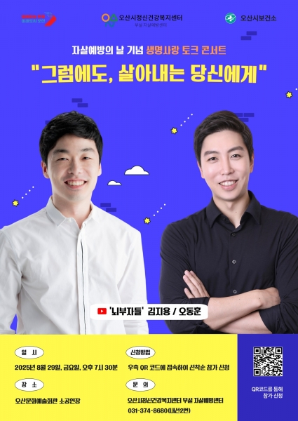 [금요저널] 오산시정신건강복지센터 부설 자살예방센터는 오는 8월 29일 오후 7시 30분, 오산문화예술회관 소공연장에서 ‘세계 자살예방의 날’을 기념해 생명존중 문화를 확산하고 자살 예방의 중요성을 알리기 위한 ‘생명사랑 토크 콘서트’를 개최한다고 밝혔다.