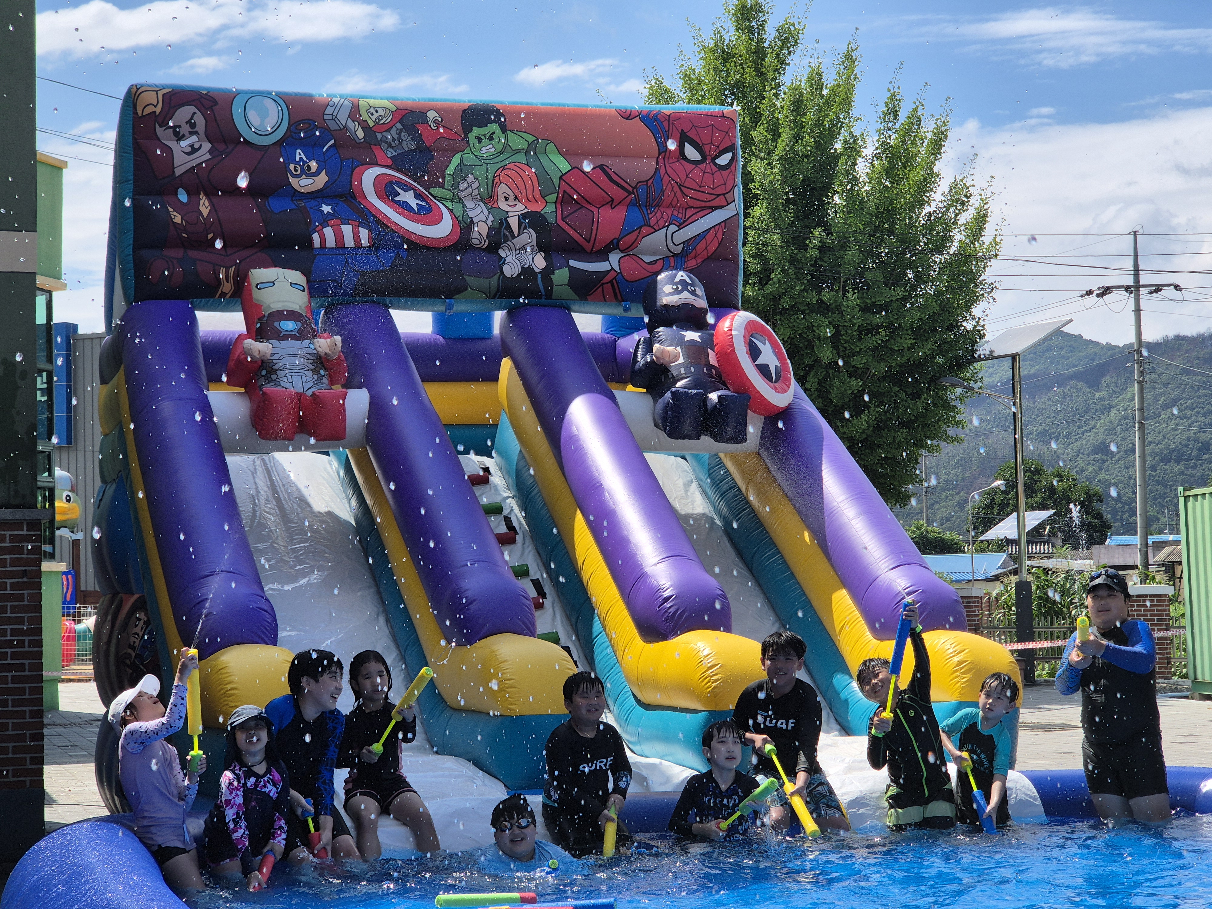옥전초등학교 운동장 한켠에 조성된 이 공간은 다양한 물놀이시설로 워터 슬라이드, 물총놀이, 낚시 놀이 등 학생들에게 즐거운 놀이터가 되었다.