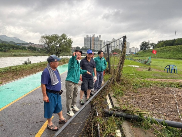 김동근 시장은 이날 아침 장암동 하천 주변의 파크골프장 피해 현장을 찾아 복구 작업에 직접 나선 시민들과 회원들에게 감사의 뜻을 전했다.