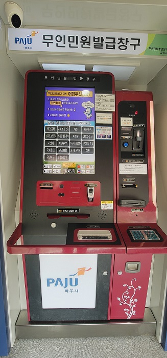 파주시는 40개소에 총 45대의 무인민원발급기를 설치 운영 중으로 17개 업무 123종의 민원서류를 발급할 수 있다.