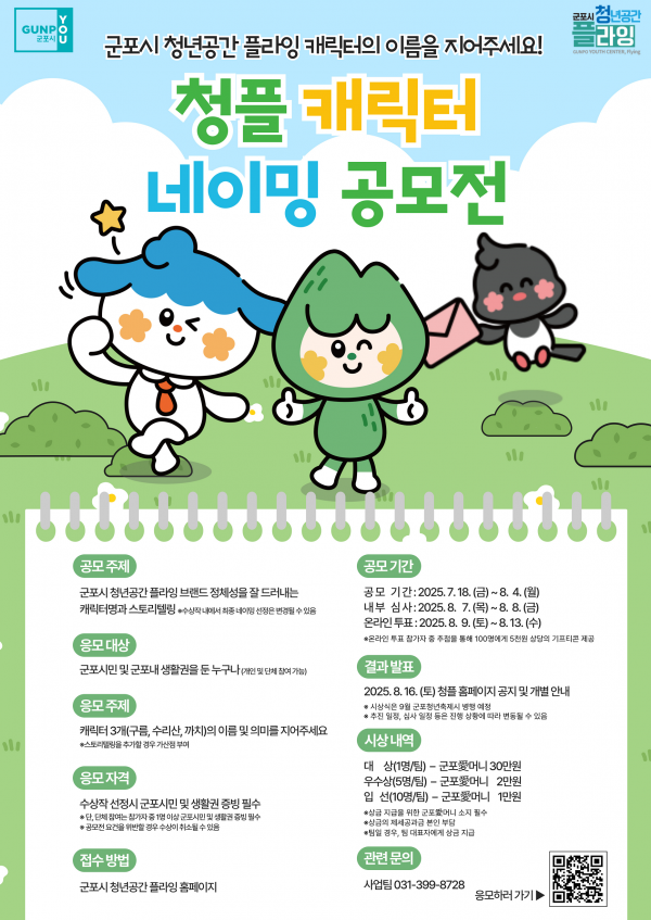 특히 각 캐릭터의 이름과 함께 군포시 청년공간 플라잉의 철학과 상징성을 담은 스토리텔링을 함께 제출할 경우 별도의 가산점이 부여된다.