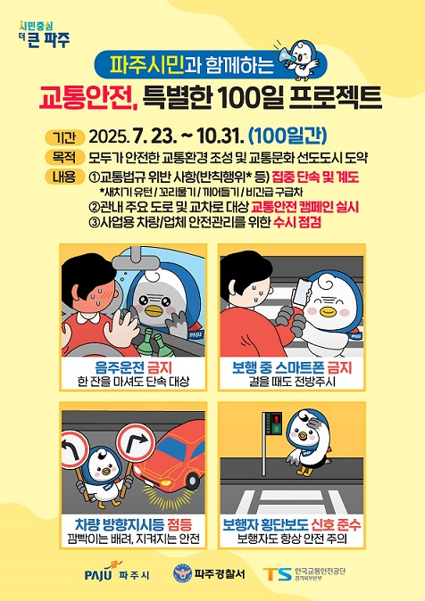 [금요저널] 파주시는 교통안전 의식을 제고하고 성숙한 교통문화 정착을 위해 앞으로 100일간 ‘교통안전, 특별한 100일 프로젝트’를 본격 추진한다고 밝혔다.