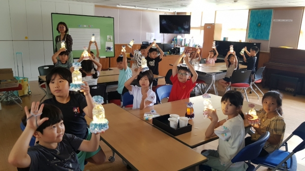 수업은 버려지는 양말목과 학생들이 마신 음료수병을 재활용해 발광다이오드 감성 랜턴을 만드는 체험형 환경 교육으로 진행됐으며 매곡초등학교 1학년~6학년 50여명의 학생이 참여했다.