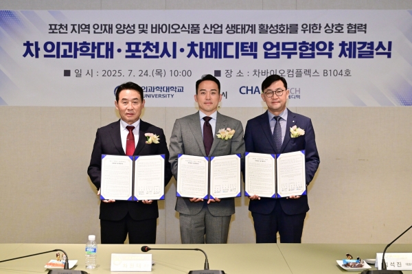 [금요저널] 포천시는 지난 24일 차바이오컴플렉스에서 차의과학대학교, 차메디텍과 포천 지역인재 양성 및 바이오식품 산업 생태계 활성화를 위한 3자 간 업무협약을 체결했다.