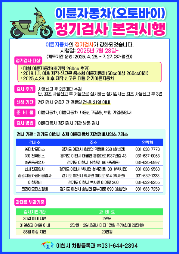 [금요저널] 이천시는 2025년 7월 28일부터 이륜자동차 검사제도를 본격 시행할 예정이다.