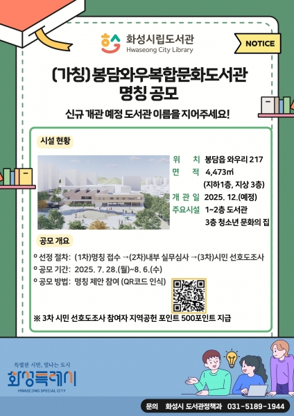 [금요저널] 화성특례시가 오는 12월 개관 예정인 봉담와우복합문화도서관의 명칭을 공모한다.