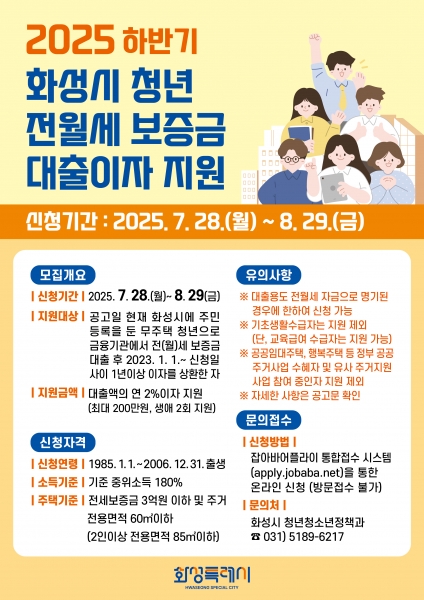 [금요저널] 화성특례시가 28일부터 청년들의 주거비 부담 경감 및 정주 여건 향상을 위해 ‘청년 전·월세 보증금 대출이자 지원 사업’ 하반기 대상자를 모집한다.